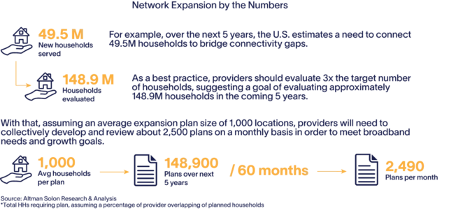 Today, billions of dollars are being deployed to address the significant Internet connectivity gaps that exist. Still, many residential and business subscribers remain unserved and underserved in the U.S. and globally. Less than 40% of households in the United States have access to more than one provider for high-speed broadband (>250 Mbps) and enterprises often struggle to compete or provide essential services without sufficient connectivity. To bridge these gaps, network operators and equity partners are increasing their investment in digital infrastructure, but inconsistencies in the network planning process present significant challenges.