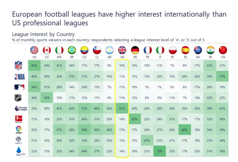 However, those interest levels, at least in the U.K. and Germany, bumped up in the most recent survey, to 16 percent, placing them ahead of other U.S. leagues and on par with non-domestic European premier football leagues in terms of popularity.